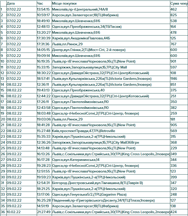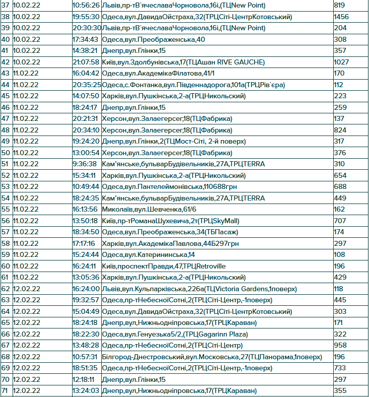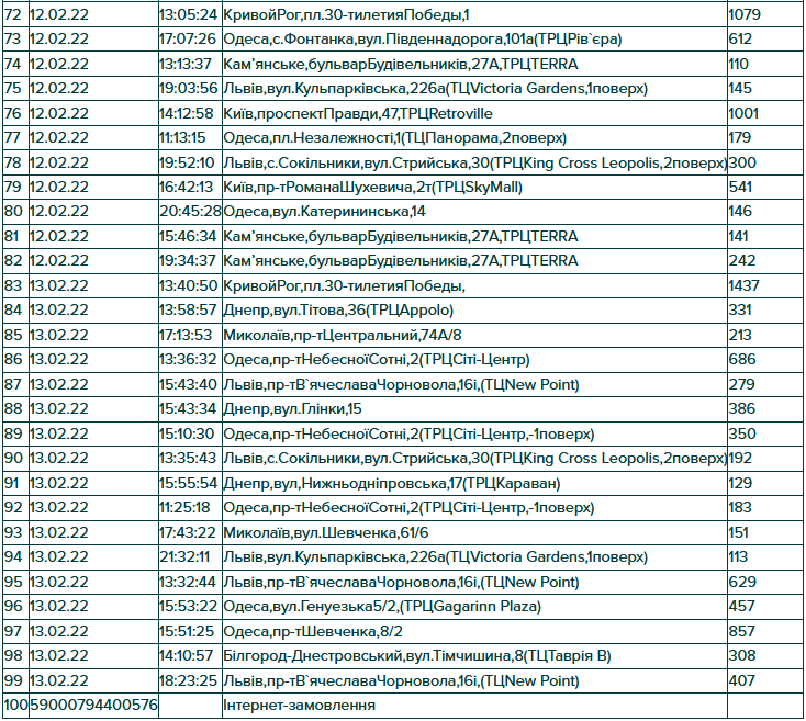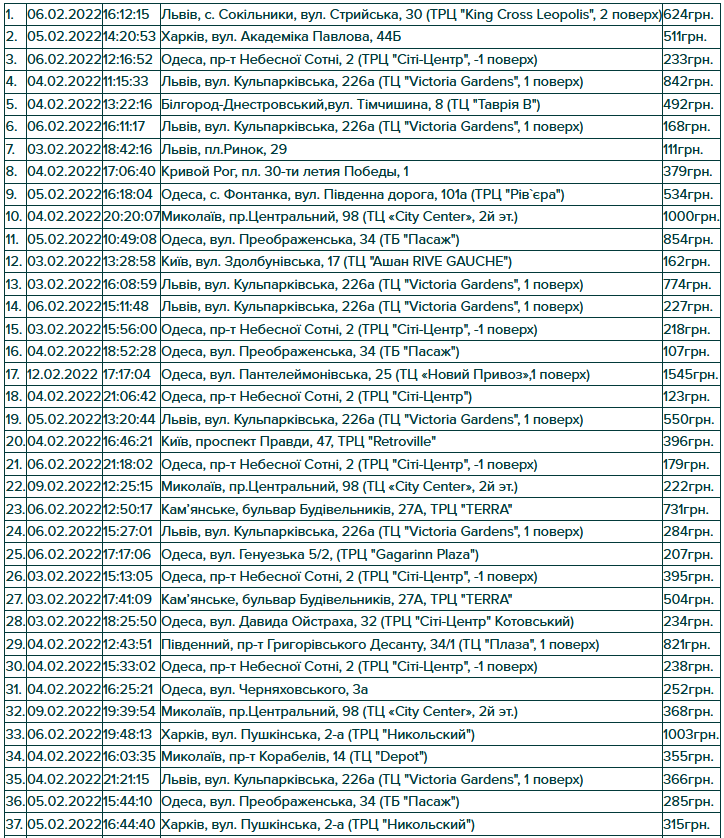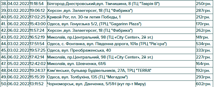 Результати розіграшу по акції “Вітай! Кохай! Надихай!” Призовий фонд акції — 100 кешбек-сертифікатів Сума сертифікату дорівнює сумі виграшного чеку. Умови акції : зробити покупку на сумму від 100 гривень у акційний період з 3 по 13 лютого 2022р. магазинах KAKTUS Розіграш проводиться серед унікальніх ідентификаторів чеків Ідентификатор складається з: дата, час, місце та сума покупки Якщо ваш оригінал чеку співпав(дата,час,місце та сума покупки) з одним із 100 чеків передзвоніть нам чи підійдіть у магазин, де була зроблена покупка з чеком та паспортом.
