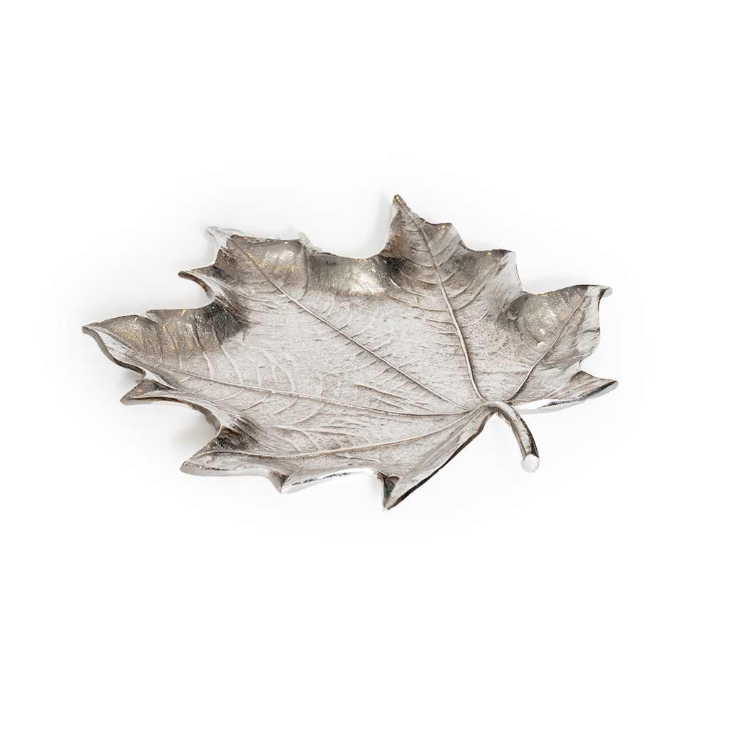 Блюдо «Клен» привносит в дом атмосферу природы. Тонкая резьба металла точно воспроизводит все детали натурального листика. Форма и размер заменят поднос или подставку для хранения бытовых мелочей. Идеально подходит для размещения колец, браслетов, ожерелий и других украшений. Отполированное серебро создает стильный акцент на фоне мебели. Блюдо используют для общего современного декорирования дома, например, для обеденного стола, кухни или офиса.