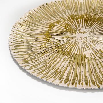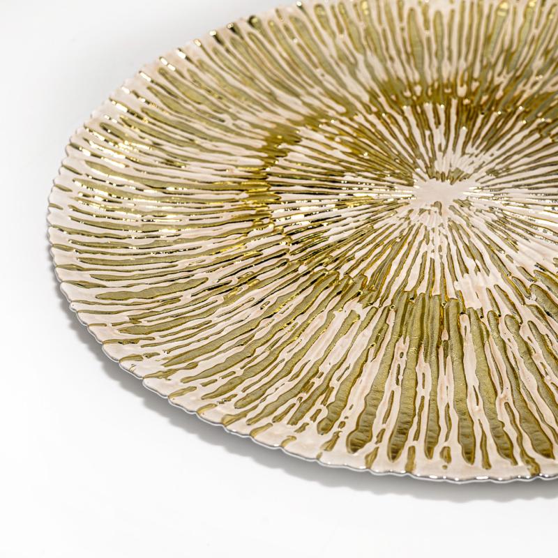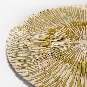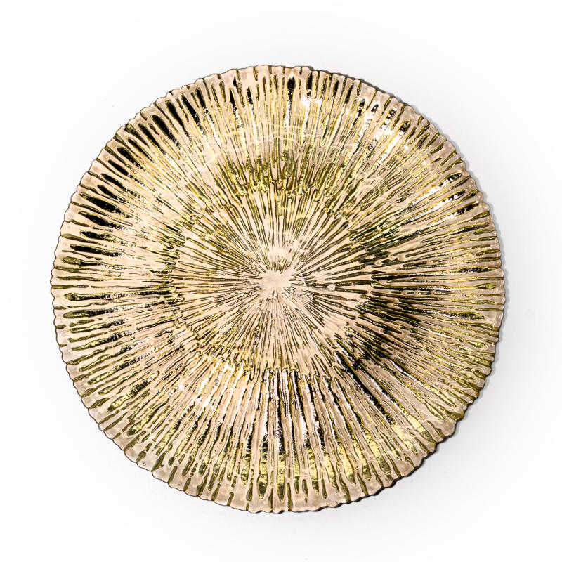Стеклянное блюдо «Антик» — эффектная стеклянная посуда с выразительным рельефом и красивым сиянием. Золотой оттенок подчеркивает элегантность блюда, а лучеобразная фактура красиво отражает свет, делая сервировку более нарядной, стильной и запоминающейся.