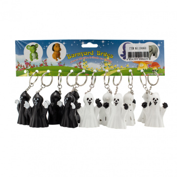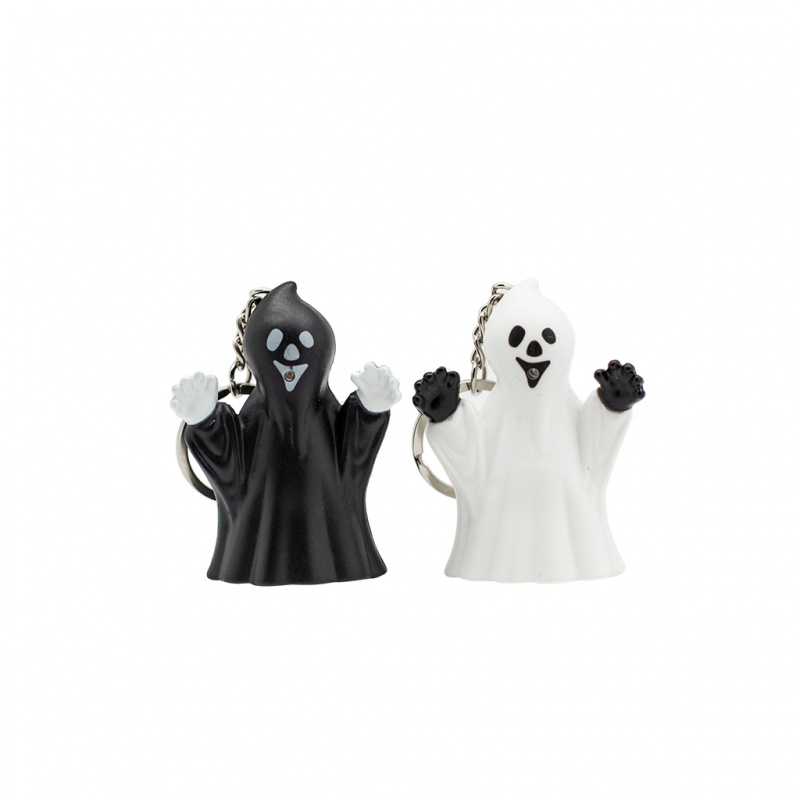 Брелок Приведение. Представлен в 2х цветах. При нажатии на кнопку глаза загораются красным светом, издает специфический пугающий звук. Батарейка входит в комплект.