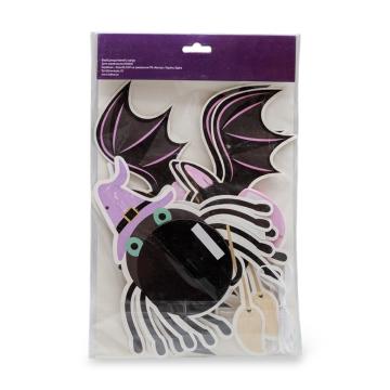 Забавные пауки в колдовских шляпах и дружные летучие мыши создают атмосферу мистики и веселья. Объёмные бумажные элементы смотрятся эффектно и добавляют динамики в оформление — будто персонажи действительно ожили и кружат над вашей вечеринкой.
