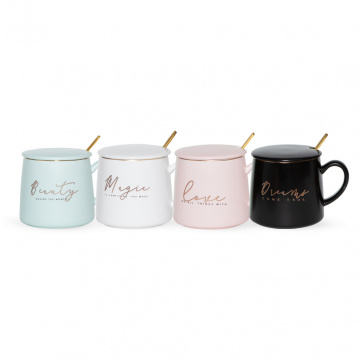 Описание Чашка Надписи золотистые с крышкой и ложкой 4 вида 400 мл