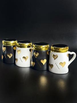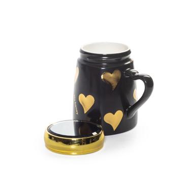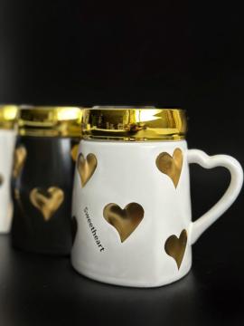 Чашки с золотыми сердечками и зеркальной крышкой выглядят очень стильно и элегантно.