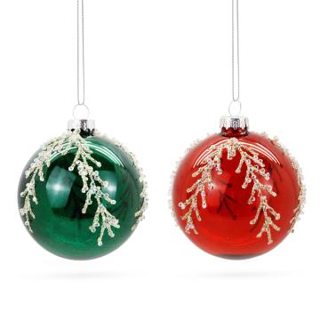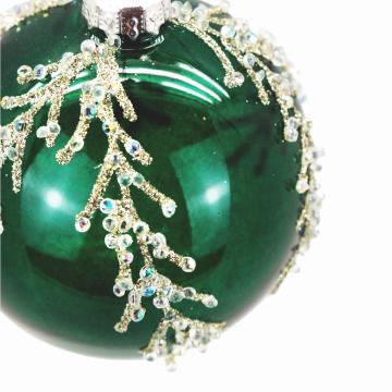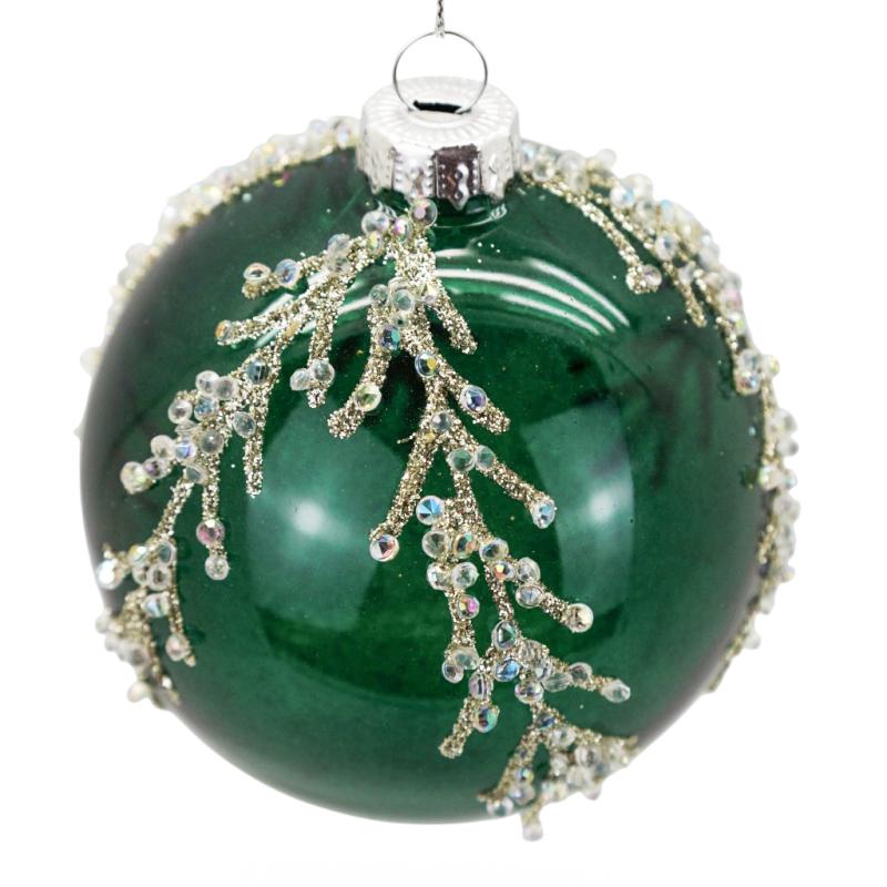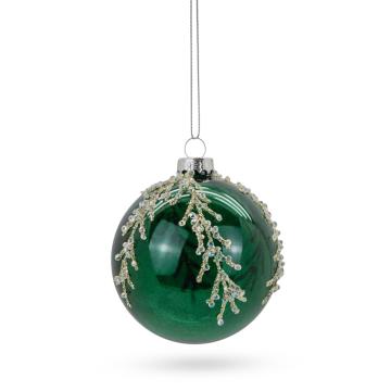 Елочная игрушка "Шар с веточками" — изумрудное волшебство на вашей ёлке. Словно покрытый инеем лесной шар, эта ёлочная игрушка из тёмно-зелёного стекла привносит в интерьер нотку зимней сказки. Золотисто-перламутровые веточки с кристаллическим бисером нежно оплетают поверхность шара, напоминая о заснеженных еловых лапках, освещённых мягким светом гирлянд.