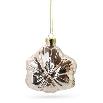 Стеклянная новогодняя игрушка элегантно смотрится как на классической зелёной ели, так и на декоративных белых или золотистых композициях — венках, гирляндах или праздничных столах. Ёлочная игрушка в виде цветка в оттенке шампань — это сочетание нежности, стиля и роскошной праздничной атмосферы.