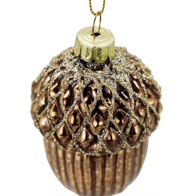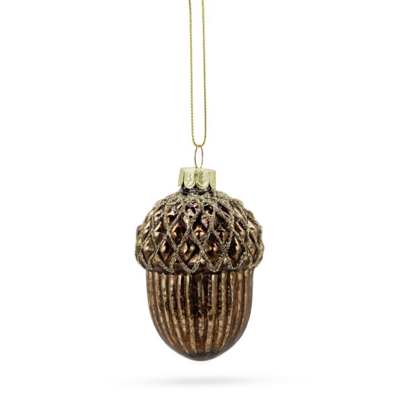 Сочетание природной формы и праздничного блеска делает коричневый желудь идеальным акцентом для декора в тёплой, уютной гамме. Стеклянный желудь в насыщенном коричневом оттенке, с рельефной поверхностью и узорной шляпкой, покрытой золотистым глиттером, напоминает о зимнем лесу и волшебстве природы. Такая новогодняя игрушка прекрасно подойдёт для оформления ёлки в эко- или винтажном стиле.