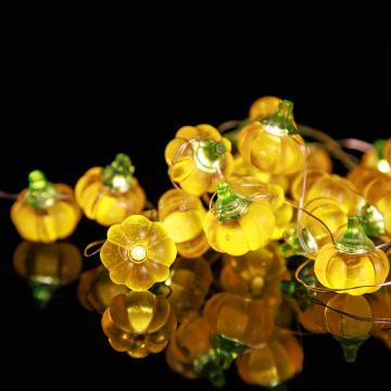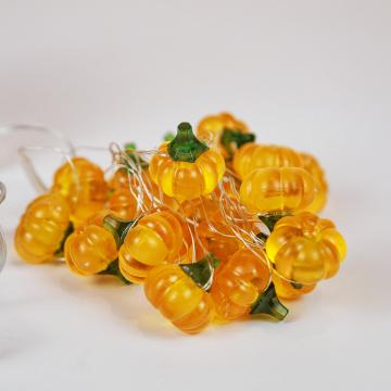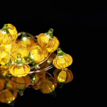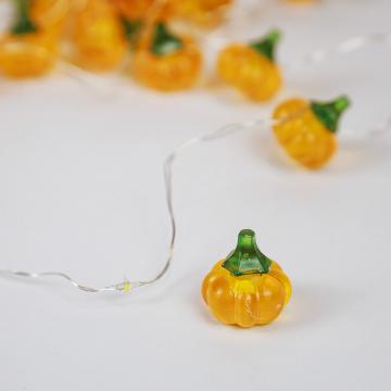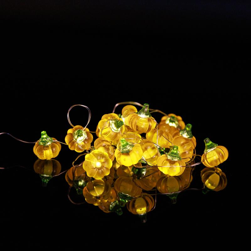 Фигурки тыквочек выполнены из полупрозрачного пластика и нанизаны на гибкий медный провод, который можно легко задекорировать в любой композиции — от гирлянды над камином до украшения праздничного стола.