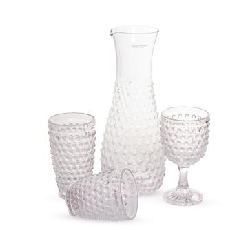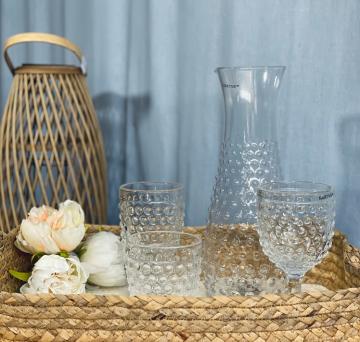 Коллекция посуды «Ice Corn» состоит из стаканов для воды и коктейля, бокала и графина. Изделия из пузырькового стекла подчеркивают элегантность сервировки и праздника. Посуду легко мыть вручную или в посудомоечной машине.