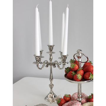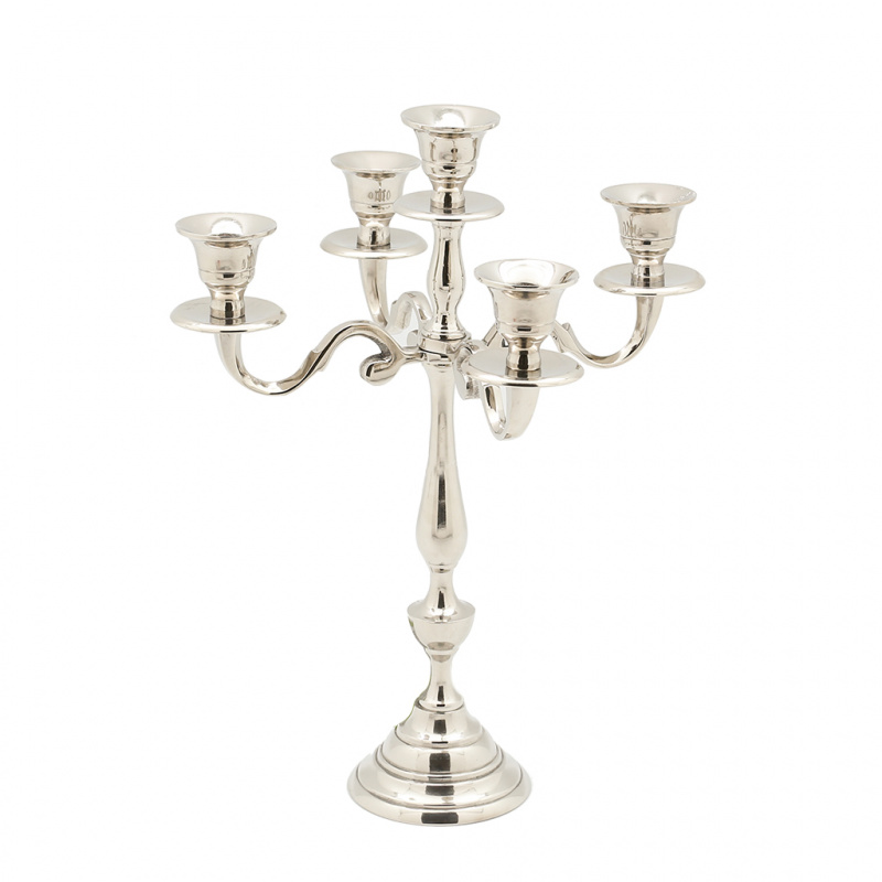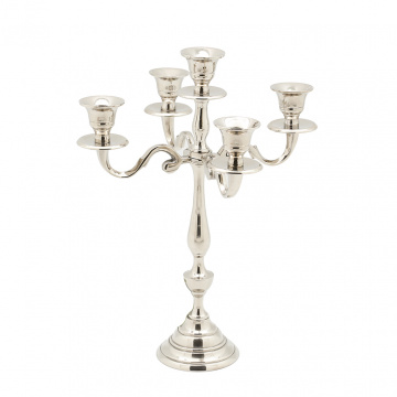 Мягкий свет пламени свечи вносит свою магию уюта и красоты в обстановку комнаты. Настольный канделябр из алюминия роскошно оформляет композицию пяти столовых свечей в одно целое. Металический аксессуар выполнен по классическим канонам ушедших эпох. Канделябр традиционно используют при офрмлении торжественных событий или семейных мероприятий. Подсвечник служит украшением свадебных церемоний, романтических фото сессий или тематических вечеринок. В интерьере гостиной или кухни канделябр поддерживает выдержанный стиль и благородный лоск. Подсвечник хорошо смотрится в центральной части стола, на каминной полке или комоде. Парные канделябры в интерьере создают эффект завершенной композиции. Добавьте обаяние классики в обустройство дома. Канделябр останется актуальным декором на долгие времена. Респектабельный подарок на свадьбу, юбилей и другое торжество вызовит положительный отклик.