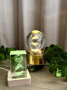 Хрустальный шар с объёмным изображением созвездия Рыб на элегантной 3D-платформе с подсветкой — это утончённый элемент интерьера и символ интуиции, мечтательности и духовной глубины. Тёплый свет мягко преломляется в кристалле, подчёркивая нежные линии и создавая атмосферу уюта и загадочности.