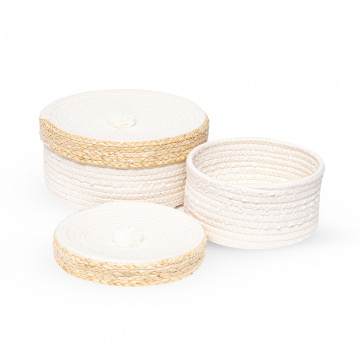 Красиво организованное пространство – залог уюта в доме. Плетеная корзинка с крышкой практично решит вопрос с хранением мелких предметов. Изделие поддержит чистоту и порядок детской комнаты или женской спальни. Корзинка с крышкой заменит шкатулку, чтобы не потерять бижутерию, аксессуары для волос и другие приятные мелочи. Плетеная емкость практична как органайзер для косметических средств по уходу. Внешний вид корзинки располагает к приятным впечатлениям. Хорошо смотрится на столике, этажерке, подоконнике и других поверхностях. Комплект белых корзин состоит из размеров S и M. Современный материал поликоттон обладает износостойкостью и практичностью в обиходе. Корзина частично сплетена из натурального материала маис. Выбирайте красивые элементы декора с полезными функциями. Рассмотрите корзинку с крышкой для качественного хранения вещей. Полезный подарок для дома детям и женщинам.