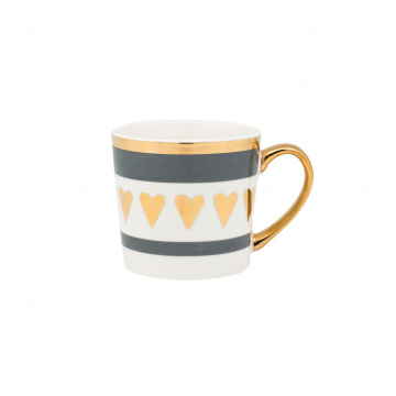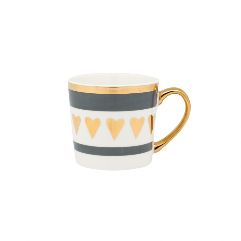 Ручка кружки, кант и рисунок сердца покрыты сусальным золотом. Не рекомендуется мыть в посудомоечной машине и с использованием абразивных средств.