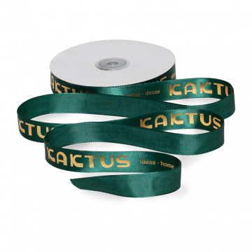Описание Лента Атлас зеленый с золотым логотипом KAKTUS 2см, 1м (50м)