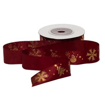 Лента атласная бордового цвета с новогодним принтом. Идеальное решение для упаковки подарков.