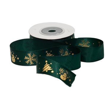 Лента атласная темно зеленого цвета с новогодним принтом. Идеальное решение для упаковки подарков.