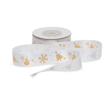 Лента атласная белого цвета с новогодним принтом. Идеальное решение для упаковки подарков.