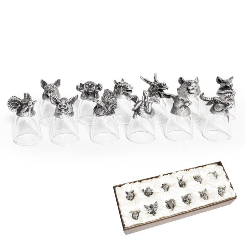 Комплект рюмок «Китайский гороскоп» достойный подарок на все времена. Каждая рюмка с изображением символа китайского гороскопа является маленьким скульптурным шедевром. Функциональное применение рюмок польстит гостям и родственникам, если вы для каждого подберете рюмку по индивидуальному гороскопу.Рюмка изготовлена из высококачественного утолщенного стекла и сплава металла. Фигурки животных серебристо-белого цвета отражают художественное мастерство. Рельефные детали маленьких скульптур изготовлены с точностью и педантичностью. Дизайн рюмок продуман таким образом, чтобы они сохраняли устойчивое положение и в перевернутом положении. Набор из двенадцати рюмок упакован в элегантную подарочную коробку.