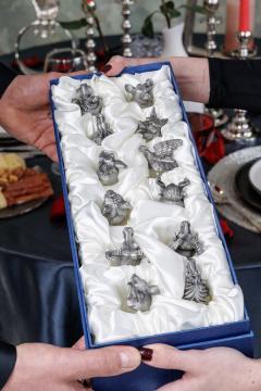 Сплав металла и утолщенное стекло соответствуют международным стандартам безопасности. Каждый набор рюмок обладает сертификатом качества.Комплект рюмок «Китайский гороскоп» живописно украсит праздничный стол и внесет свою лепту в оживление атмосферы.Миниатюрный комплект скульптурных шедевров