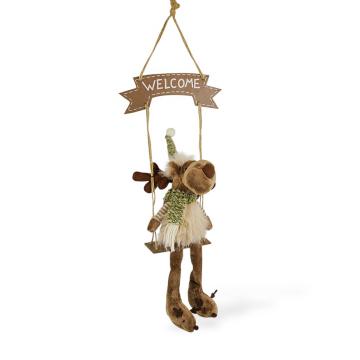 Олень в уютном зимнем наряде и вязаном зелёном колпаке сидит на качелях, а над ним красуется табличка Welcome. Такая фигурка станет стильным акцентом новогоднего интерьера и идеально подойдёт для украшения прихожей, двери, камина или праздничной витрины.