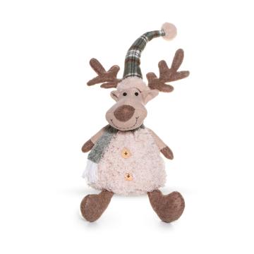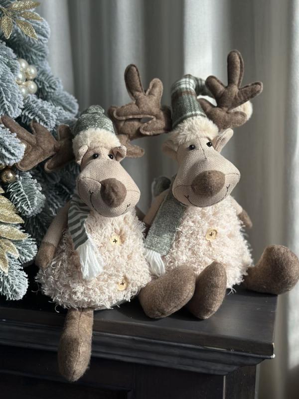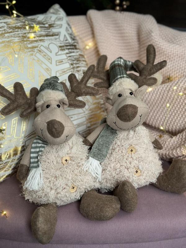 Сидячий олень в мягкой кремовой шубкой и полосатым шарфиком станет стильным акцентом вашего новогоднего декора. Фигурка выполнена из приятного на ощупь текстиля и оснащена утяжелителем, что позволяет использовать ее не только как элемент украшения, но и как дверной стоппер, идеальный для детской комнаты.
