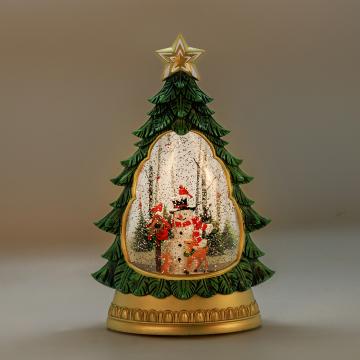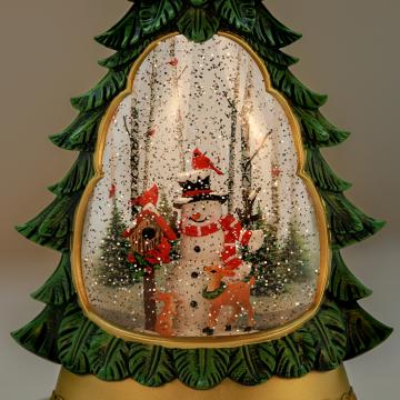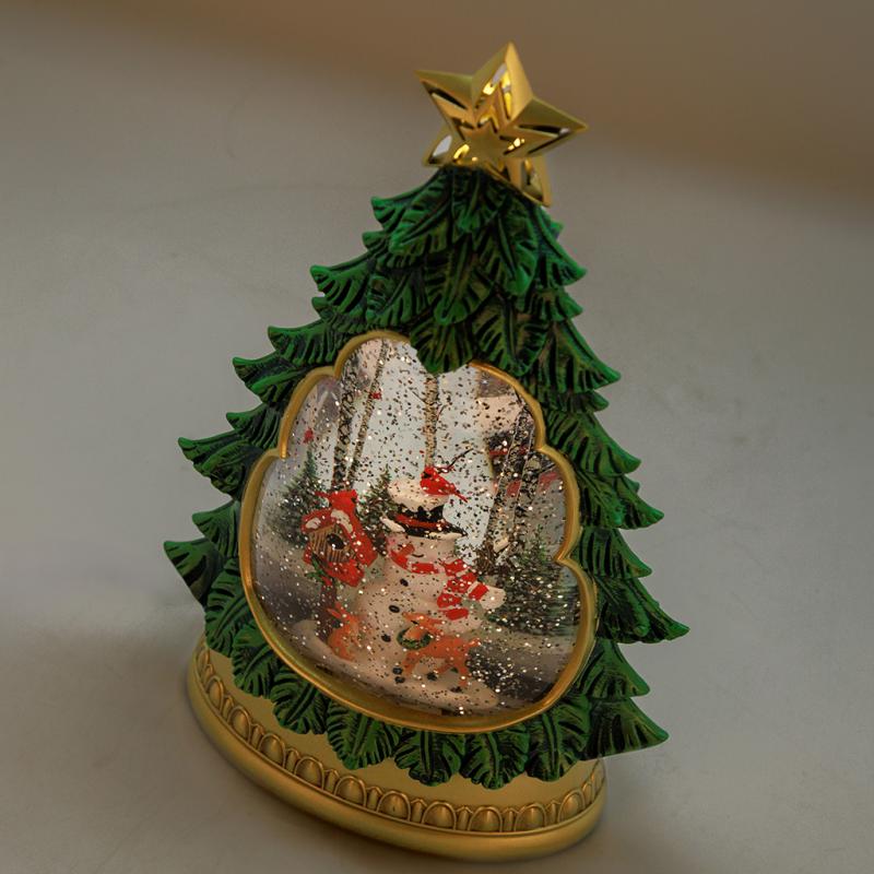 Снежный шар «Елка со снеговиком» — это словно окно в волшебную зимнюю страну. Пышная зелёная ель с золотой звездой на вершине скрывает внутри настоящую рождественскую сказку: весёлый снеговик с алым шарфом, лесные зверушки и уютный домик, возле которого кружатся снежинки. Подсветка придаёт композиции сияние, музыка наполняет пространство чарующими мелодиями, а автоподдув оживляет картину мягким вихрем снега.