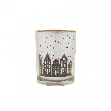 Описание Подсвеч стекло НГ платинов ,Домики,10*12.5 см