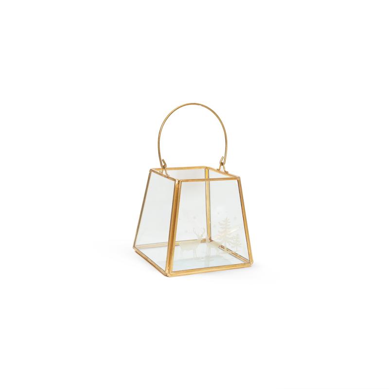 Подсвечник-фонарь из крепкого стекла и латуни выглядит нарядно и элегантно в период зимнего сезона. Наполнение игрушками, гирляндами, декором делает изделие уникальным.
