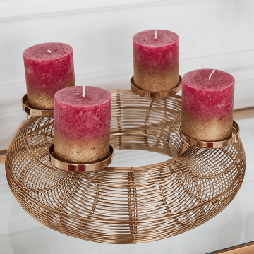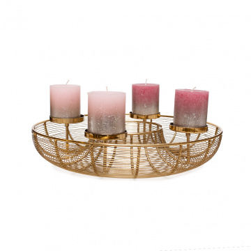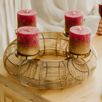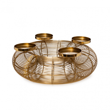 Зажженные свечи на столе – залог атмосферного вечера. Металлический подсвечник вызывает симпатию как украшение и функциональный декор для дома.Плетеное изделие выполнено в форме круга для четырех свечей. Гармонично смотрится в центре праздничного стола. Подсвечник легко дополнить цветами, гирляндами или новогодними игрушками. Эффектно дополняет интерьер в период тематических праздников.