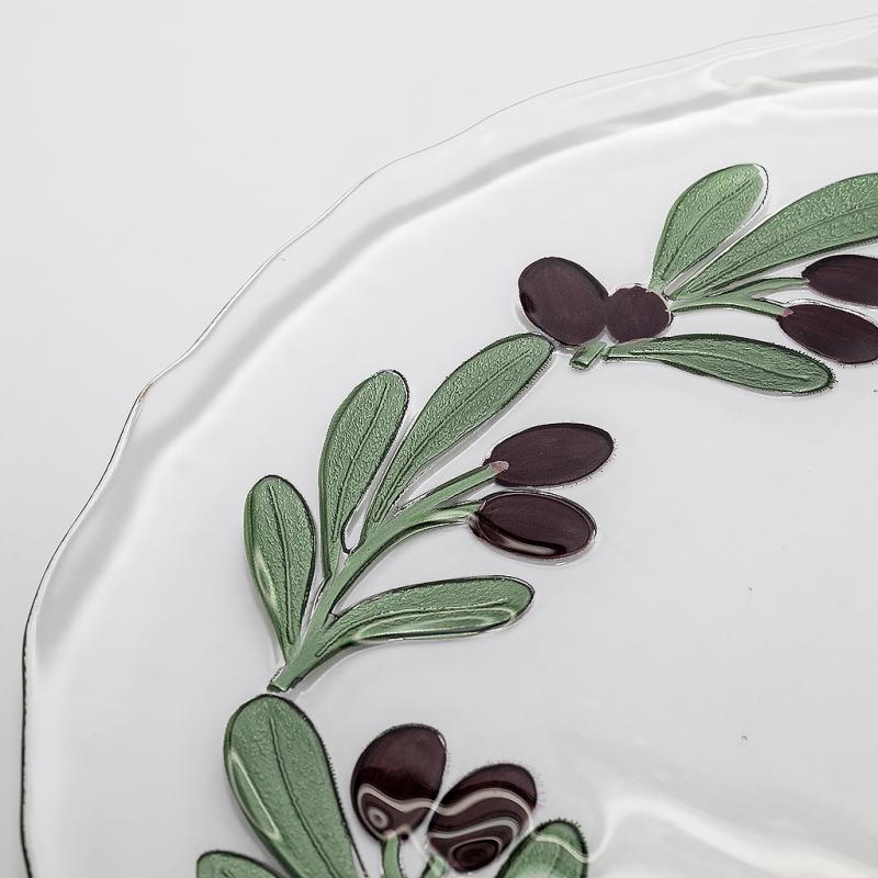Стеклянный подтарельник красиво подчеркивает подачу основных блюд, помогает оформить стол более аккуратно и делает сервировку завершенной. Оливковый декор придает композиции теплое средиземноморское настроение, а сама стеклянная основа для тарелки гармонично смотрится как в повседневной, так и в праздничной подаче.