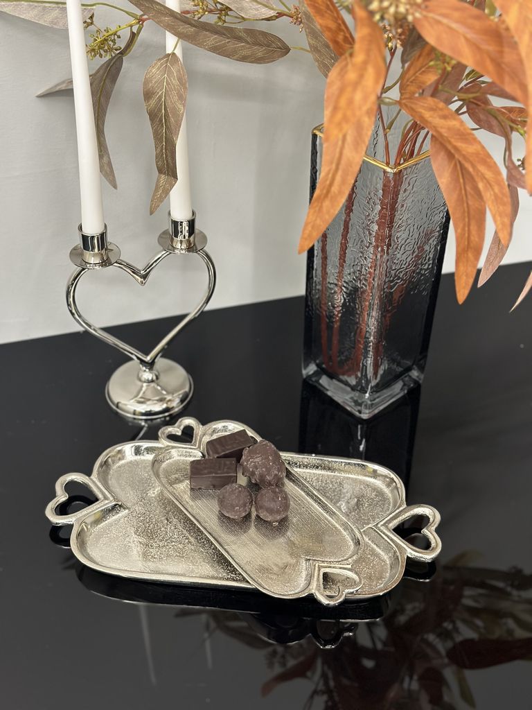 Добавьте в ваш интерьер стильный элемент в виде разноса прямоугольной формы «Сердце» в элегантном серебристом оттенке! Изготовленный из прочного алюминия, поднос не только обладает великолепным внешним видом, но и практичен в использовании. Разнос с ручками в форме сердец представлен в двух размерах, что позволяет выбрать идеальный вариант для вашего пространства. Используйте его для размещения свечей, ароматических масел, сухоцветов или тематических статуэток — разнос станет настоящей изюминкой вашего декора, привнося в дом нотку оригинальности и шарма.
