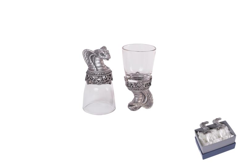 Набор рюмок «Кобра» рассчитан на взыскательных мужчин с экзотическим вкусом. Добротное качество стаканов с восточным изображением кобры задобрит самого строгого эстета. Подарочные рюмки могут быть использованы функционально для мужских посиделок или стать предметом коллекционирования.Знак кобры воплощает в себе царскую мудрость и защиту домашнего очага.Каждая рюмка изготовлена из высококачественного утолщенного стекла и сплава металла на оловянной основе. Фигурки змей серебристого цвета отражают художественное мастерство. Рельефные детали змеи выполнены с безукоризненной точностью и аккуратностью. Дизайн рюмок продуман таким образом, чтобы они сохраняли устойчивое положение и в перевернутом положении. Две одинаковые рюмки упакованы в изящную подарочную коробку.Сплав металла и утолщенное стекло соответствуют международным стандартам безопасности. Каждый набор рюмок обладает сертификатом качества.