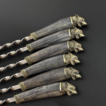 Описание Шампура с декоративной ручкой Волк в буковом кейсе 6 шт