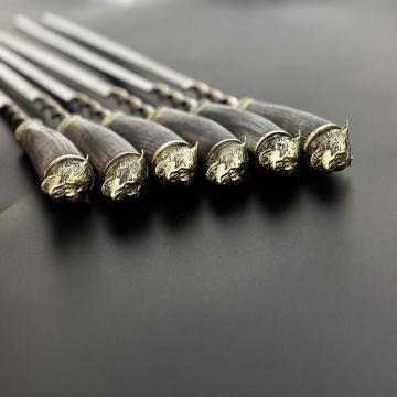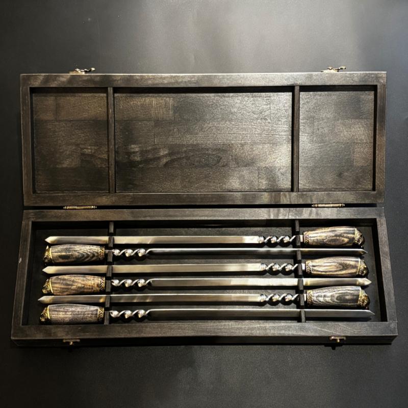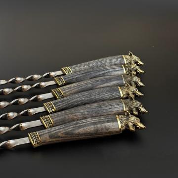 Шампуры "Волк" в буковом кейсе — это не просто шампуры, это символ силы, свободы и характера. Рукояти украшены объёмными головами волков, отлитыми вручную с филигранной детализацией. Каждый шампур передаёт мощь и уверенность, превращая процесс готовки в настоящее удовольствие.