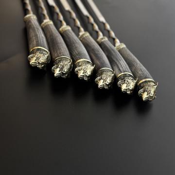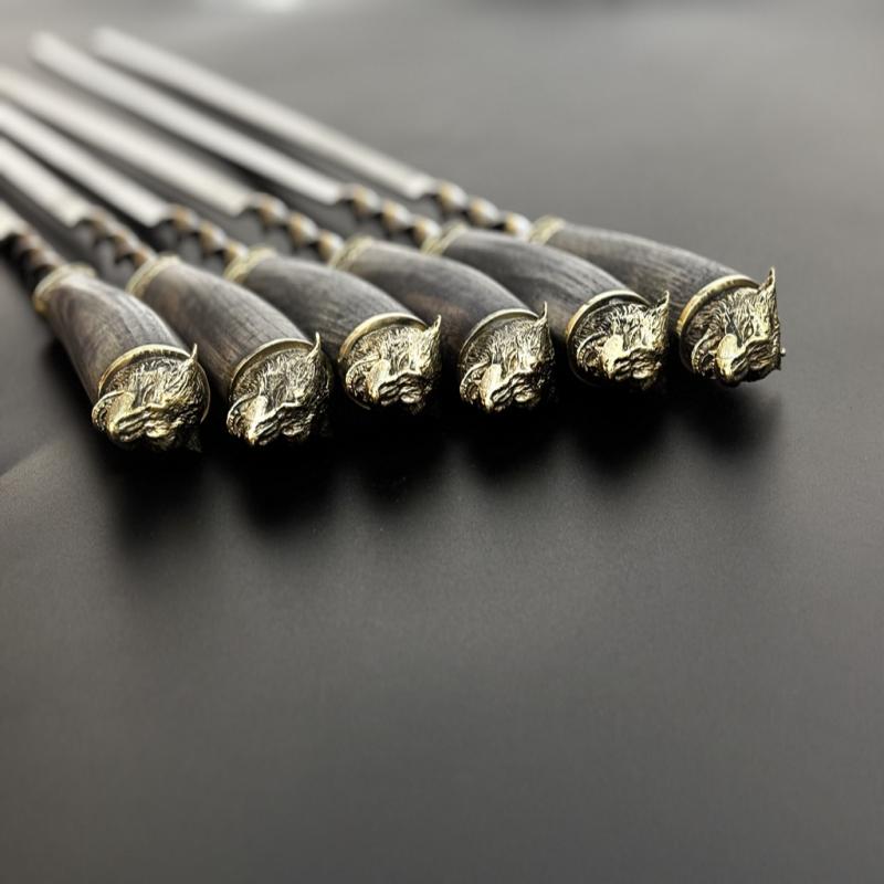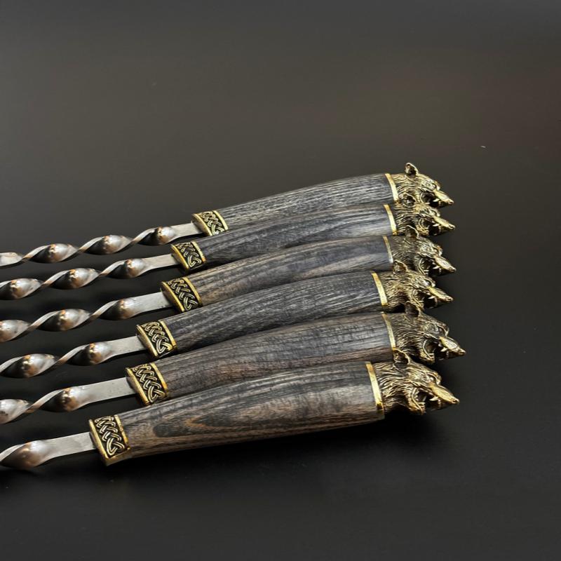 Рукояти в виде головы волка выполнены вручную, с мельчайшей детализацией — каждый шампур уникален. Металл сочетается с фактурным деревом, создавая по-настоящему статусную вещь.