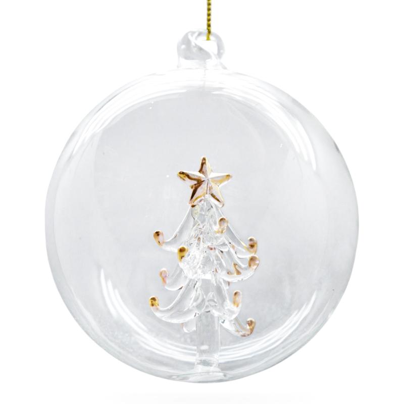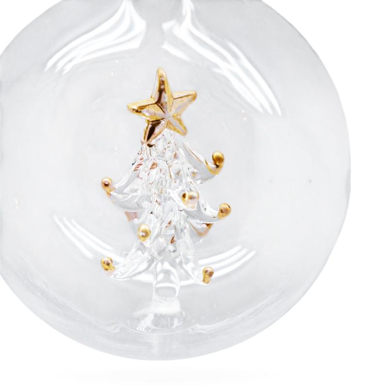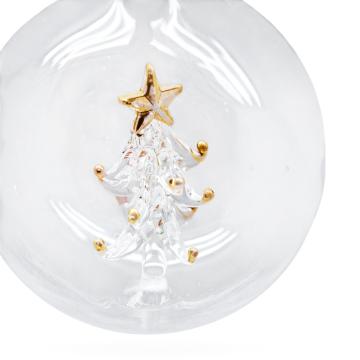 Очаровательная стеклянная игрушка в форме шара с внутренней миниатюрной ёлочкой словно переносит в зимнюю сказку. Прозрачная сфера создаёт эффект волшебного ёлочного шара, в центре которого — утончённая стеклянная ёлочка, украшенная золотыми акцентами и венчающаяся сияющей звездой. Каждая деталь ёлочного шара выточена с любовью, отражая свет и добавляя сияния праздничному декору.