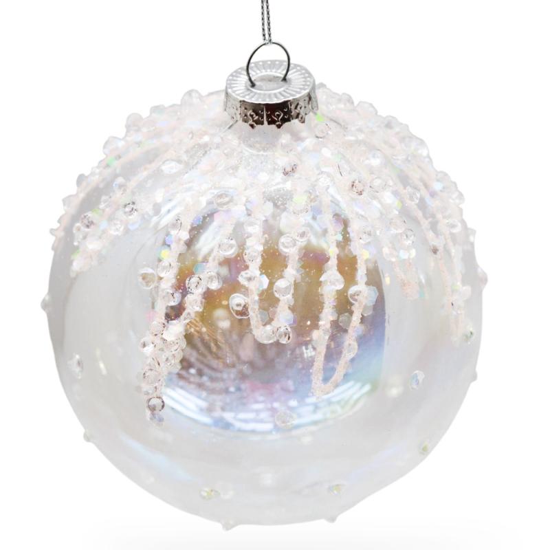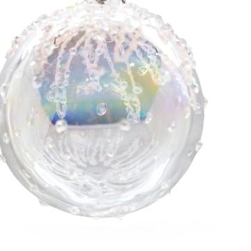 Елочная игрушка шар Aurora прозрачный с пайетками — словно замерзшая слеза северного сияния, заключённая в стекле. Переливчатые пайетки и бисерные капли, спускающиеся с вершины ёлочного шара, создают эффект хрустального инея, который мерцает всеми оттенками зимнего волшебства.