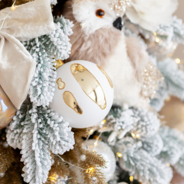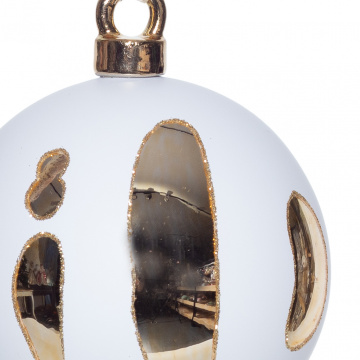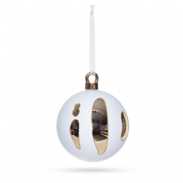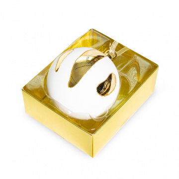 Все что связано с тигром имеет особое значение для наступающего года. Матовый шар с тигровыми пятнами актуален для тематического украшения елки. На белом фоне золото сверкает мягкими переливами, излучая в атмосферу теплоту и счастье.