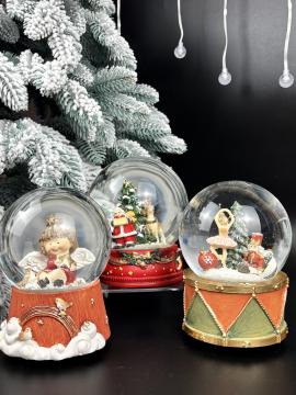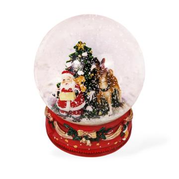 В центре этого роскошного снежного шара — классическая рождественская сцена: добрый Санта-Клаус с подарками и его верный олень у нарядной ёлки, украшенной золотой звездой. Словно остановившийся момент из зимней сказки, он оживает каждый раз, когда вы встряхиваете снежный шар — снежинки начинают кружиться, создавая ощущение свежего волшебного снегопада.
