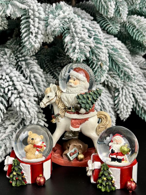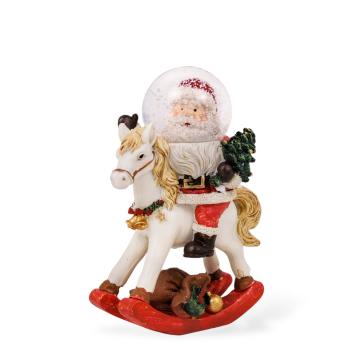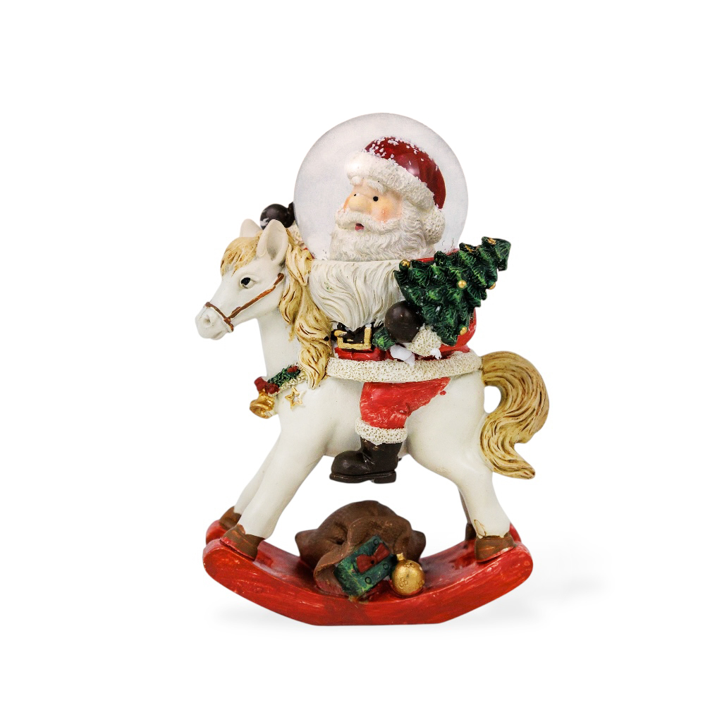 Санта-Клаус спешит к вам верхом — не на санях, а на лошадке! Этот необычный шар со снегом совмещает в себе любимую зимнюю сказку и тёплый винтажный шарм. Внутри стеклянного купола — улыбающийся Санта с подарками и ёлкой в руках, а вся композиция расположена на качающейся игрушечной лошадке с праздничными деталями.