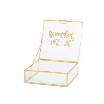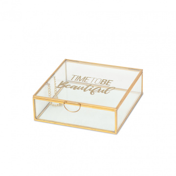 Не знаете, каким сюрпризом порадовать девушку? Шкатулка из стекла Time to be beautiful добавляет блеск и радость в глаза любимой женщины. Прозрачное стекло и золото латуни – самый главный тренд на сегодняшний день. Стеклянная шкатулка не скрывает красоты ювелирного изделия, а наоборот – визуально подчеркивает прелести огранки драгоценных камней. Крышка откидывается мягко и элегантно благодаря прикрепленной внутри цепочки. Оригинальный футляр для хранения женских аксессуаров, очков, бижутерии, косметических средств. Элегантно и практично украшает макияжный столик. Коллекция декора из стекла и латуни производит впечатление престижных изделий. Металл обладает прочными и антикоррозийными свойствами. Разновидность шкатулок, подсвечников, подносов и фото рамок в едином стиле создают великолепные возможности в интерьере. Сделайте красивый жест для удовольствия женщины. Приходите в гости без банальных конфет. Подарите шкатулку Time to be beautiful наполненную украшениями.