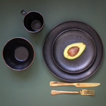 Комплект La Rosee Noir состоит из обеденной и десертной тарелок, плошки и чашки. Эффектно комбинировать черные элементы с посудой серии La Rosee Blanche белого цвета.