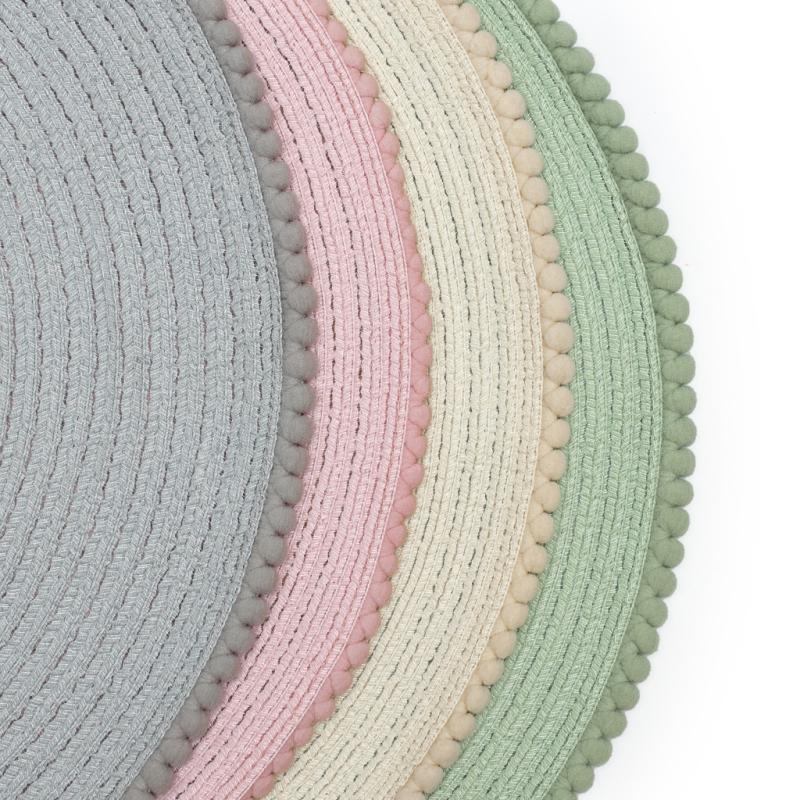 Салфетка имеет круглую форму и декорирована по краю пушистыми помпонами, которые придают ей игривый и воздушный вид.