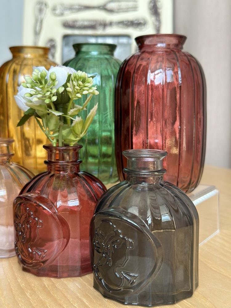 Многообразие цветовых решений. В наличии имеются различные цвета вазы — розовый, темно-серый, янтарно-желтый и красный, позволяя выбрать идеальный вариант для любого интерьера.