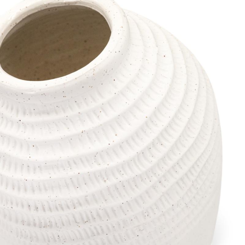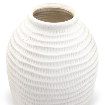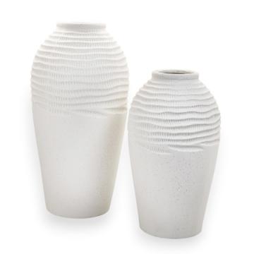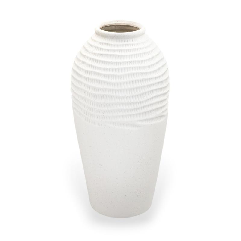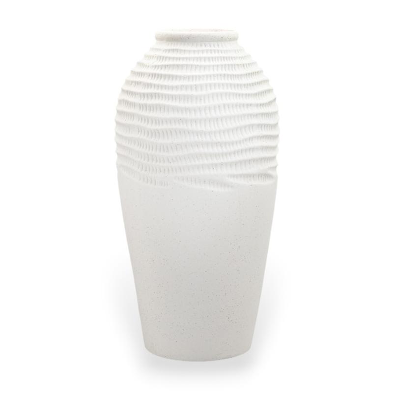 Silk Lines — большая керамическая ваза с очень спокойным, чистым настроением. Мягкий белый цвет и волнистый рельеф в верхней части делают ее визуально легкой и изящной, словно поверхность слегка тронута шелковыми складками. Такая напольная ваза не перегружает интерьер, а помогает добавить ему больше света, порядка и гармонии.