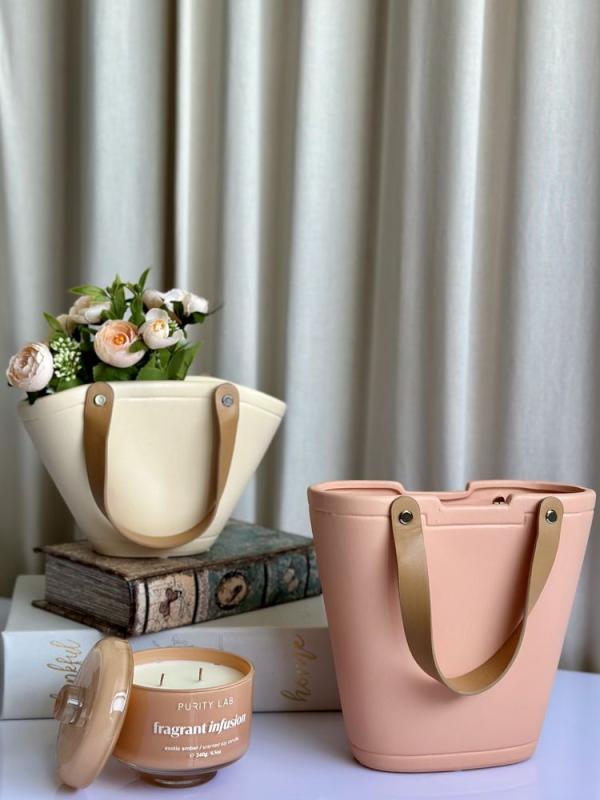Керамическая ваза в виде сумки - это уникальное сочетание функциональности и эстетики. Ваза доступна в нескольких цветах: кремовом, персиковом, оранжевом и голубом, что позволяет выбрать подходящий вариант под любой интерьер. Используйте вазу для сухих декораций или искусственных цветов. Это открывает широкие возможности для творчества и экспериментов с различными элементами декора, такими как сухие цветы, ветки, камни и другие предметы.