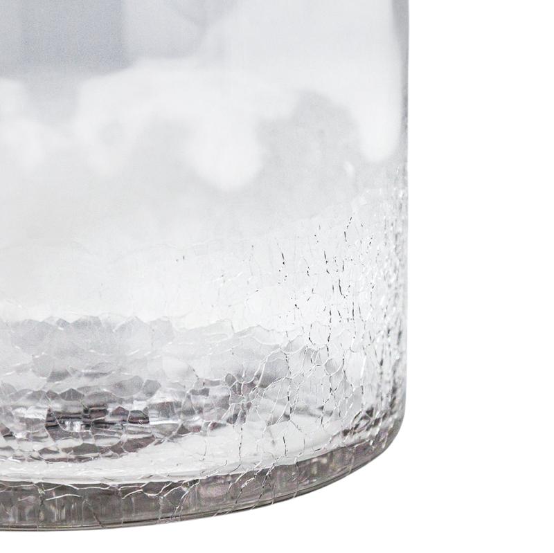 Прозрачное стекло с эффектом «ледяных трещин» создаёт игру света и придаёт вазе особый характер. Благодаря универсальной форме ваза подходит для различных интерьерных решений: можно использовать для небольших букетов, сухоцветов, декоративных веточек или как самостоятельный элемент декора.