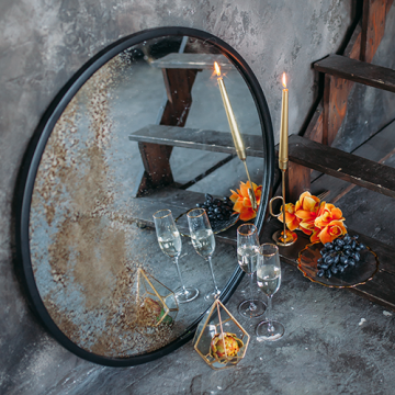 Создает притягательный акцент на стене античное зеркало. Изделие с эффектом старинной вещи придает атмосфере тайну и загадочность. Золотая патина выступает в роли некой драгоценности для владельца дома. Зеркало внушительных размеров выделяет стену гостиной, прихожей, спальни. Любая комната выигрывает от необычного акцента над диваном, комодом или каминной полки. Зеркальное панно востребовано как модный декор для свадебных фото сессий, гостиничного холла, респектабельного ресторана.