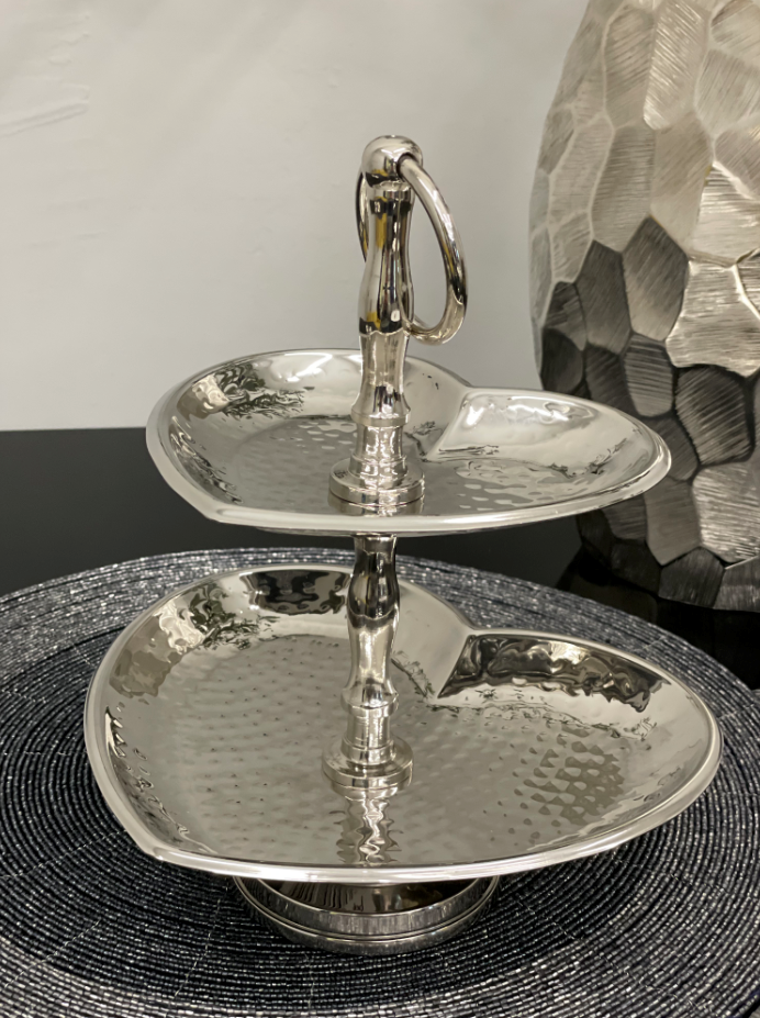 Двоярусне блюдо «Серце» - це стильний та креативний елемент сервірування, який привертає увагу своєю вишуканою формою. Яруси блюда виконані у вигляді сердець, символізуючи тепло, турботу та затишок, а елегантне сріблясте покриття надає композиції благородного та святкового вигляду.