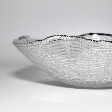 Глибоке скляне блюдо «Хвиля» — елегантний скляний посуд для сервірування, який привертає увагу плавною формою, рельєфною фактурою та акуратною сріблястою окантовкою. Прозоре скло красиво відбиває світло, а хвилеподібний силует робить блюдо зі скла виразнішим, легким і сучаснішим.