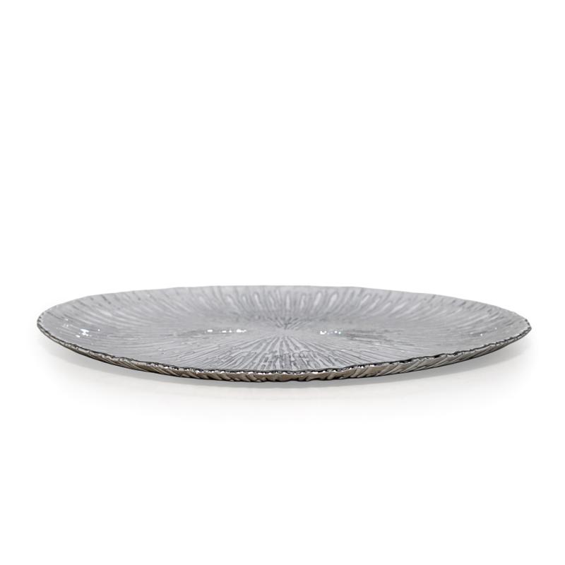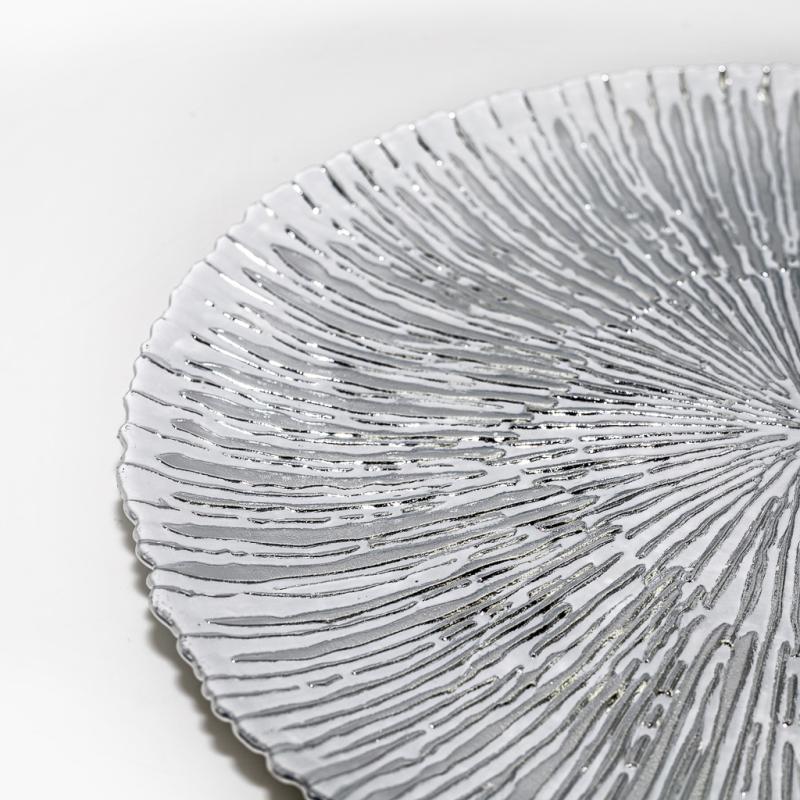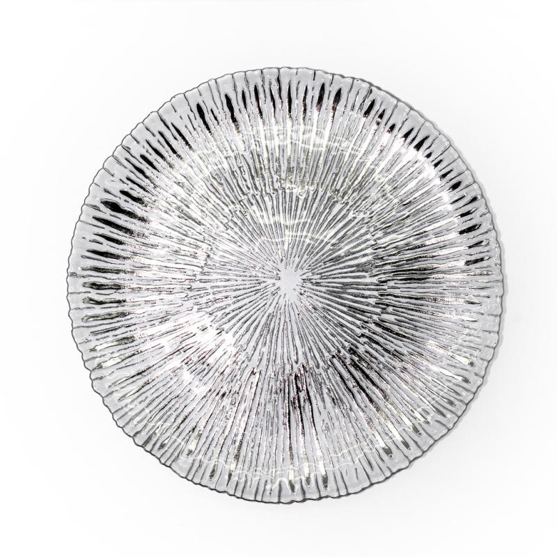 Скляне блюдо «Антік » - ефектний скляний посуд з виразним рельєфом та гарним сяйвом. Срібний відтінок підкреслює елегантність страви, а променеподібна фактура красиво відображає світло, роблячи сервірування більш ошатним, стильним і незабутнім.